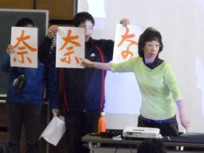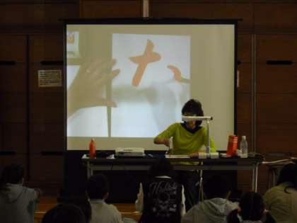 6年生の書き初め指導の様子です。芦花中学校の籠谷先生(国語)を講師として招き、指導してもらいました。6年生3学級が格技室に集い、指導を受けます。お手本を示す籠谷先生の筆運びがスクリーンに映し出され、子どもたちはそれを見ながら学びます。