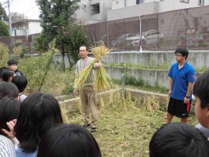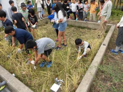 16日(火)、5年生は学級ごとに稲刈りを行いました。総合的な学習の時間に1学期から取り組んできた学習です。講師の先生から、教室で精米にいたるまでの話をしていただきました。その後、田んぼに行き、一人一株ずつ稲を刈りました。最後に講師の先生が稲をわらで束ねるところを見せてくださいました。教室の様子は1組、稲刈りの様子は3組です。