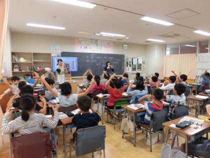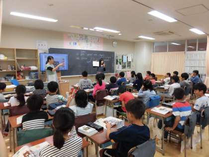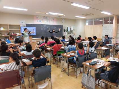 16日(火)の4時間目、4年2組は外国語の時間でした。ALTの先生とともに文房具や形容詞の表現の練習をしました。「大きい・小さい」「厚い・薄い」などは身体表現をしながら楽しんでいました。