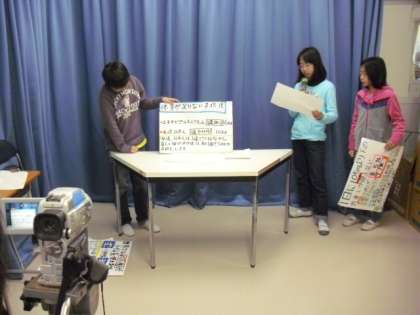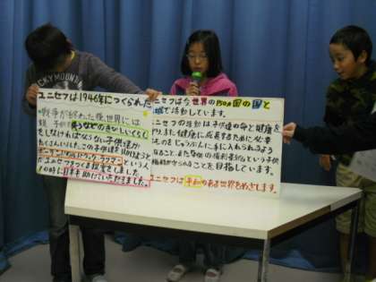お昼の校内放送の様子です。代表委員会がテレビ放送による「ユニセフ募金」の呼びかけを行っているところです。自分たちで調べた世界の子どもたちの現状等を伝えながら、募金への協力の呼びかけました。募金は来年の1月18日から行います。