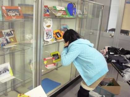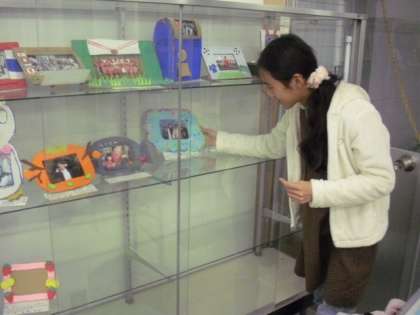 図工で制作している写真立てを展示している様子です。第一昇降口のガラスケースに完成した写真立てを自分で展示をしています。工夫された写真立てに、6年生の思い出の1枚の写真が飾られています。