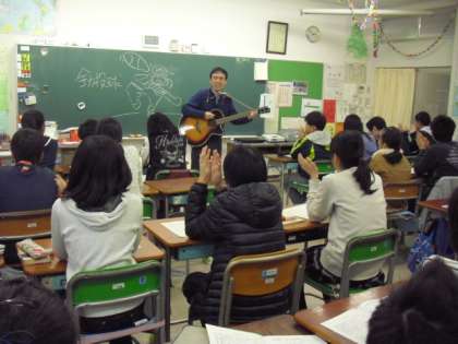 6年生の道徳の授業の様子です。芦花中学校の後田先生を講師に招き行いました。後田先生は、芦花小学校・芦花中学校の卒業生で、この町に住んでいました。先輩でもあり、現在は芦花中学校の先生でもあるわけです。前半は「全力投球」をテーマにした中学校に向けての心構えの話、後半は歌を歌ってくれました。先日のクリスマスコンサートでも歌った3曲です。芦花の地域を歌詞にした歌をみんなで歌いました。最後は全員とハイタッチをして、再会を約束しました。