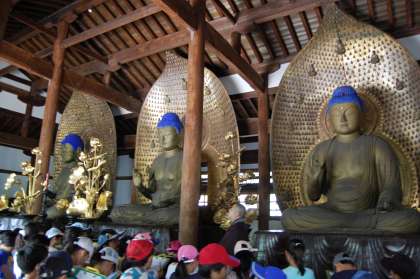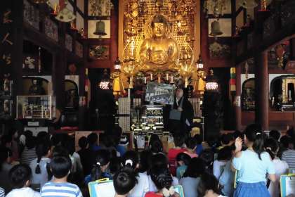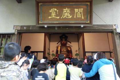 九品仏浄真寺は、3年に一度「おめんかぶり」が行われることで全国的にも有名なお寺です。子どもたちは2グループに分かれ、境内をくまなく見て回りました。本堂の厳かな雰囲気、九品の阿弥陀如来の慈愛に触れ、最後には閻魔大王の姿を拝しました。「笑顔に見えれば日頃から良い行いをしている人」とのお話に、一同「笑顔に見える!」と口にしていました。