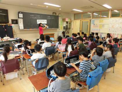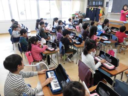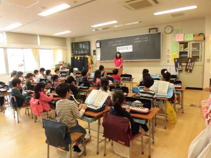 19日(金)の4時間目、1年4組は音楽の時間でした。けんばんハーモニカの練習をしていました。3本の指を使いながら、音の上りと下りの練習をしました。子どもたちの演奏する音が回を追うごとにそろって聞こえるようになりました。