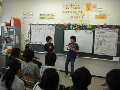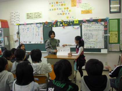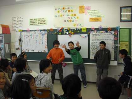 5年生の学級活動の様子です。「お楽しみ会」で楽しんでいるところです。高学年の学級活動では、信頼し支え合って楽しく豊かな学級や学校の生活をつくるとともに、日常の生活や学習に自主的に取り組もうとする態度の向上に資する活動を行うことが大切です。このクラスでは、全員が出し物を行うのではなく、司会やプログラム作成、装飾、そして出し物等、役割を分担して行う方法を取り入れています。このような取り組みが子どもたちの企画・運営力を高めていくのです。