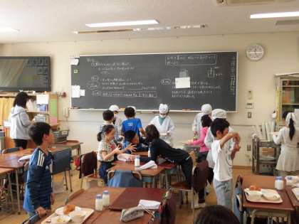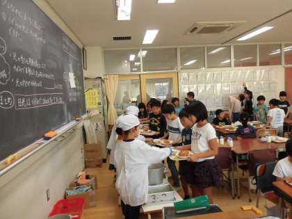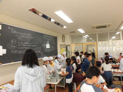 本校では、12時15分から13時までが給食の時間です。4時間目が終わると各教室で給食の準備が始まります。写真は、3年2組の様子です。当番が身じたくを整えて、手際よく盛りつけをしていました。