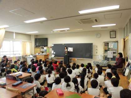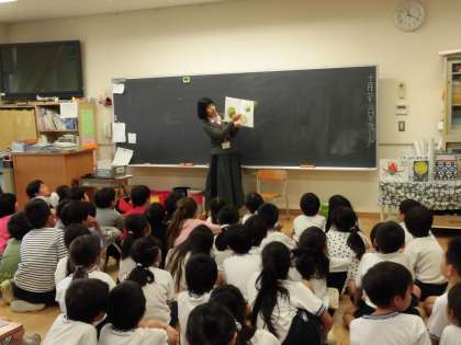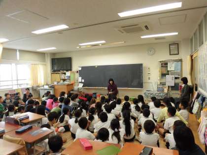 23日(火)の1〜3時間目にかけて3年生はお話会に参加しました。グループ名「たんぽぽ〜語りと本〜」から2名の方にお越しいただきました。子どもたちは、「やまんばのにしき」に登場する生まれたばかりのやまんばの赤ん坊の行動に驚いたり、キャベツの惑星に住む動物の名前や生態を笑ったりしていました。写真は、3時間目の1組と2組の様子です。