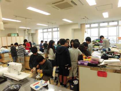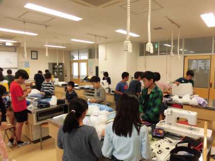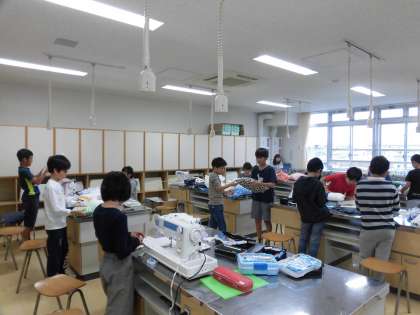 23日(火)の3・4時間目、5年2組は家庭科の時間でした。展覧会に出品する「お気に入りクッション」を作っています。ミシンぬいが終わった人から先生に見てもらい、その後、綿入れをしました。クッションの最後の一辺は手ぬいで行うため、数人ずつ先生の周りに集まり、やり方を直接見て学んでいました。完成はもうすぐです。