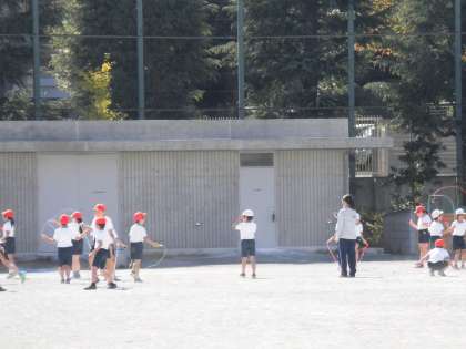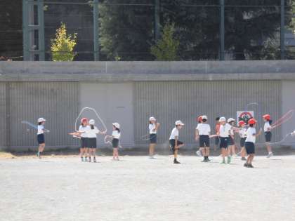 29日(月)の4時間目、3年2組は体育の時間でした。短なわとびの練習をしていました。29日から短なわ月間が始まっているので、様々なとび方に挑戦していました。