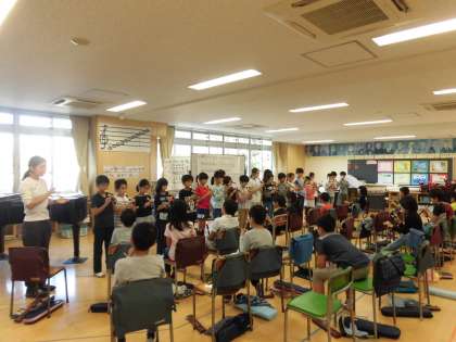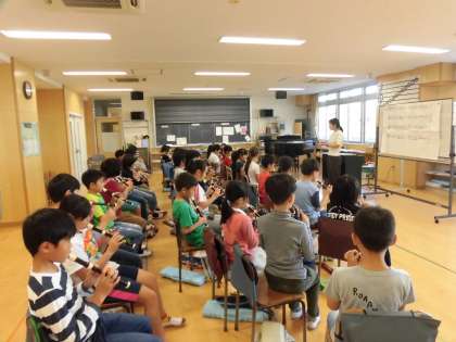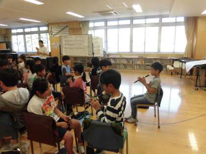 29日(月)の4時間目、4年2組は音楽の時間でした。題材名「ゆかいな船長」のリコーダーの練習をしていました。となりの人と練習をしたり、みんなで教え合ったりしながら最後は全員で合わせました。