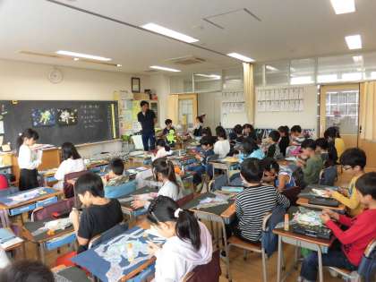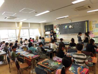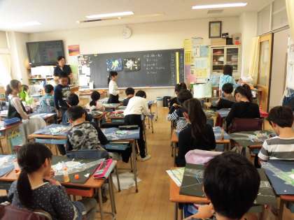 31日(水)の1・2時間目、3年5組は図画工作の時間でした。展覧会に出品予定の平面作品作りに取り組んでいました。宇宙をイメージして、天の川の流れをたくさんの白い点で表現していました。さらに宇宙船も登場して、宇宙人もいて・・・といよいよ完成のようです。