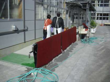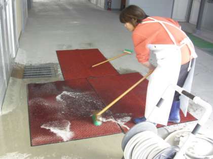主事さんが、校舎内の水飲み場に敷いてあるマットを洗っている様子です。事前に1時間ほど洗剤の入ったお湯につけておき、水を流しながらブラシを使ってすすぎ洗いをしているところです。全部で十数枚ありますが、子どもたちが気持ちよく新学期を迎えることができるようにすべて洗いました。洗った後は、日光でよく乾かします。
