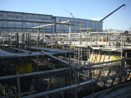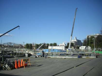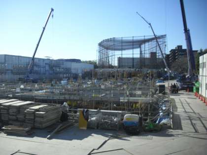 いつもとは違う角度からの工事の様子です。東側から西側を見渡しています。先ほどお見せしたテニスコートの裏側が一番作業が進んでいるので、東側は基礎工事の段階です。大きなクレーン車でいくつもの資材を運んでいます。たくさんの人の手によって新校舎が築かれていきます。