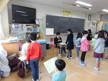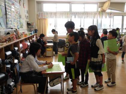 5日(月)の3時間目、2年生は全クラスで「かけ算九九交流検定」を行いました。検定してくださるのは芦花中学校の1年生です。今回はC組の皆さんにご協力をいただきました。授業時間内の20分間を検定にあてました。中学生の前で一人ずつ2の段から5の段までの検定を受けました。中学生に「合格だよ。」「がんばったね。」とやさしく声をかけてもらい、子どもたちはとても喜んでいました。