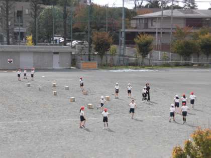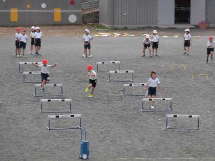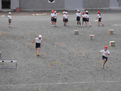 7日(水)の4時間目、3年3組は体育の時間でした。校庭で小型ハードル走に取り組んでいました。立方体の箱、ミニハードル、ハードルの3種類を用意し、それぞれに上手にとび越す練習をしていました。