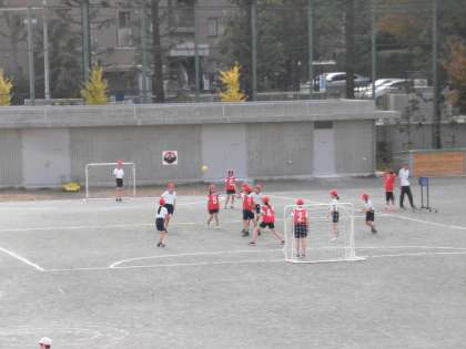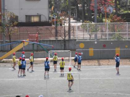 8日(木)の4時間目、6年4組は体育の時間でした。シュート型ゲームとして「ハンドボール」に取り組んでいました。ボール投げをしてからゲームをしました。パスを出したり、もらったりするために声をかけ合うことができました。