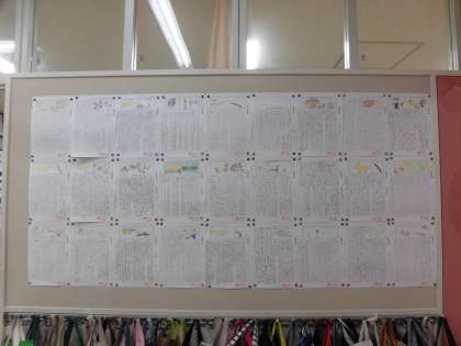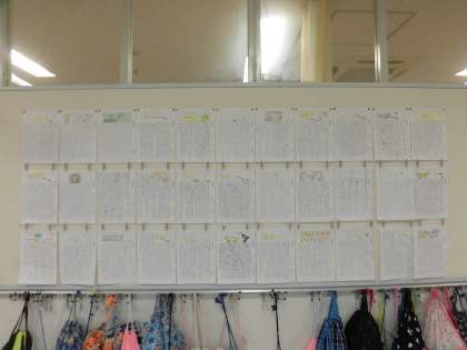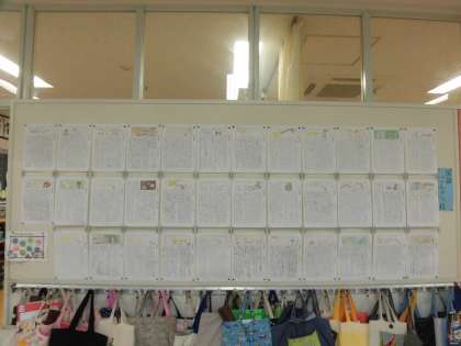 4年生のろう下には、国語の時間に読み進めてきた「ごんぎつね」の感想を掲示しています。きつねのごんに対する子どもたちの気持ちの変化がよく現れています。お話の一こまを絵でも表現しています。