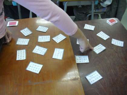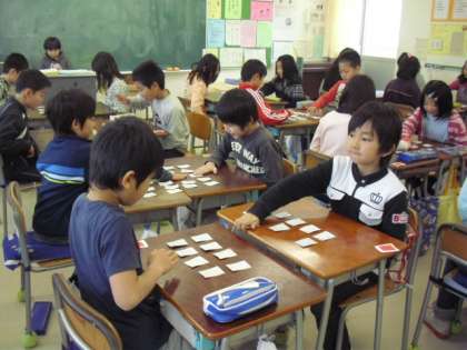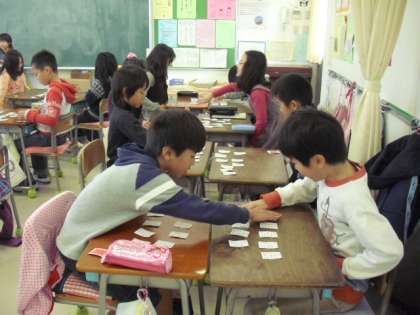 3年生の日本語の授業の様子です。二人一組になって、百人一首に取り組んでいるところです。楽しみながら日本語に親しむ授業です。読み手も子どもが行います。使っている百人一首の札は手作りのものです。「はいっ!」「あった〜!」元気のよい声が教室に響き渡っていました。