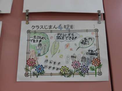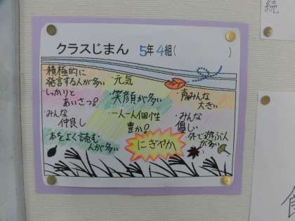 11月はふれあい月間です。今回は各学級でクラスの自慢できることについて話し合い、ろう下に掲示しています。写真は上から、2年1組、4年2組、5年4組です。
