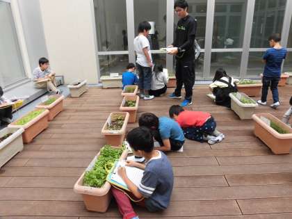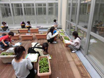 12日(月)の3時間目、2年2組は生活科の時間でした。育てている野菜を観察していました。グループごとにプランターのそばに行き、野菜の特ちょうをつかんでいました。その後教室にもどり、気付いたことをみんなでまとめました。