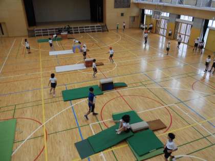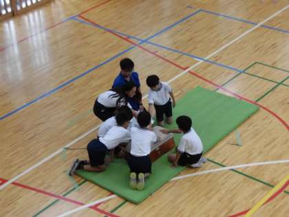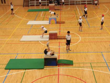 12日(月)の3時間目、5年3組は体育の時間でした。体育館で「とび箱」に取り組んでいました。開脚とびや台上前転の練習をくり返し行っていました。