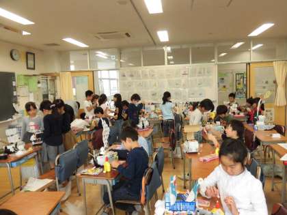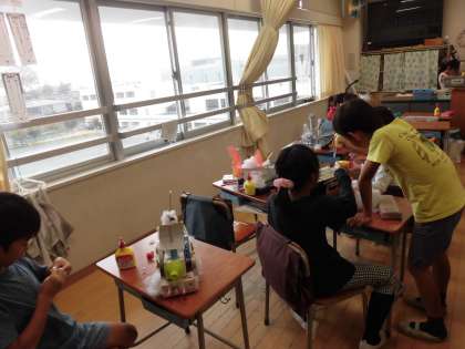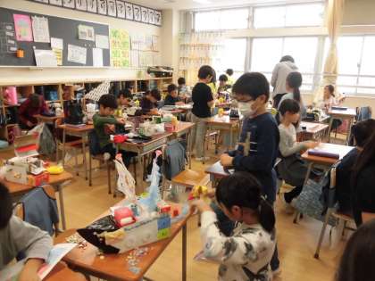 13日(火)の5・6時間目、3年1組は図画工作の時間でした。展覧会に出品する立体作品「船」の仕上げに取り組んでいました。すでに完成した人は友達の手伝いをしたり、展覧会会場に取り付ける飾り作りをしたりしていました。