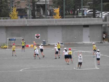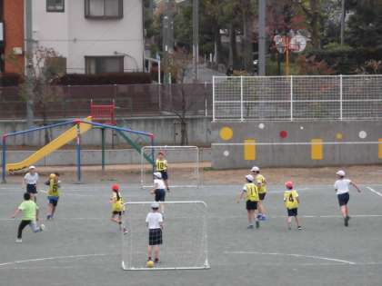 13日(火)の6時間目、6年1組は体育の時間でした。校庭でハンドボールに取り組んでいました。3コートを用意し6チームが同時にゲームをしていました。パスをすばやく回すことができていました。