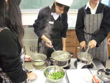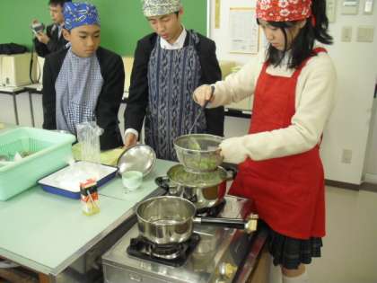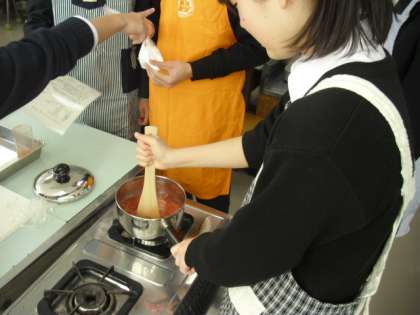 沸騰させてあったお湯に、切った食材を入れて中火で煮詰めていきます。焦げたり固まったりしないように、しゃもじで混ぜながら煮詰めます。砂糖を数回に分けて加えながら同じように煮詰めていきます。小学生に正しく教えることができるように、中学生も一生懸命です。