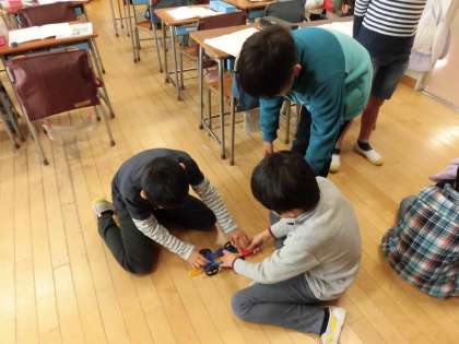 19日(月)の1・2時間目、3年2組は理科の時間でした。単元名「ゴムのはたらき」に入り、グループで学習をしていました。ゴムを取り付けて引っ張り手を離すと車が走り出すキットを使っていました。これから学習を深めていきます。
