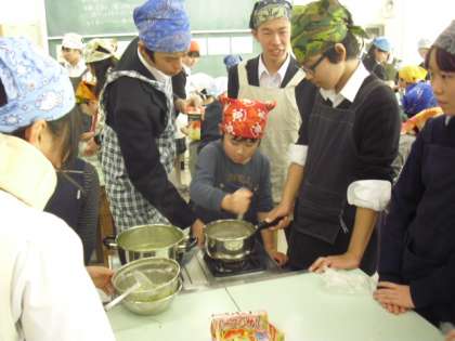 切った食材をお湯の入ったなべに入れ煮詰めているところです。「切った野菜をいれて」「こぼさないように、ゆっくりかき混ぜて」と中学生の指示通りに作業が進んでいきます。心配になると、手をそえて3年生に教えてくれる中学生です。
