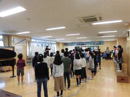 21日(水)午前7時30分から合唱団の朝練習が始まりました。20日、21日にかけて新たなピアニストとしてお二人が来校してくださいました。今後、朝練習や合唱交歓会にも参加してくださいます。指揮者との打ち合わせもしながら伴奏をしていただきました。子どもたちは、「われは海の子」の最初のリズムを正しくとれるように繰り返し練習をしていました。