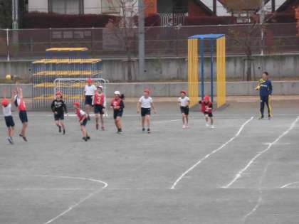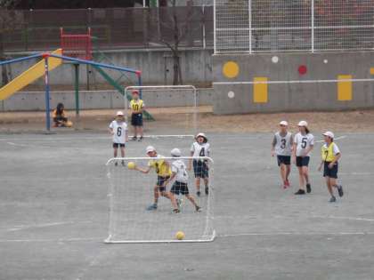 22日(木)の3時間目、6年1組は体育の時間でした。校庭でハンドボールに取り組んでいました。回を重ねるごとにパスやシュートが上手になってきています。