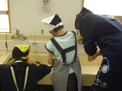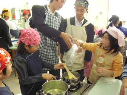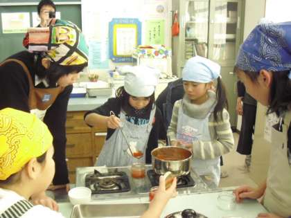 砂糖を加えながら煮詰めていきます。とろみが出てきたら完成です。びんの中にコンフィチュールを入れていきます。中学生がお手本を見せてくれて、それに習って小学生がそっとびんに入れます。中学生はじっと見守っています。後片付けもいっしょに行います。