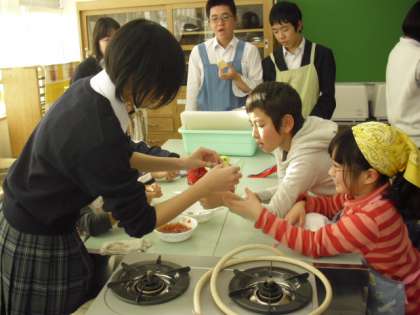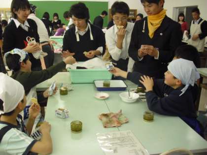 完成したコンフィチュールを試食します。試食用のクラッカーは小学生だけしかもっていませんでしたが、中学生と仲良く分け合って食べました。小学生も中学生もうれしそうです。中学生を見ながら笑顔で食べる小学生。中学生のやさしい眼差しがありました。このような活動を通して生徒の自己有用感がはぐくまれていくことを期待します。