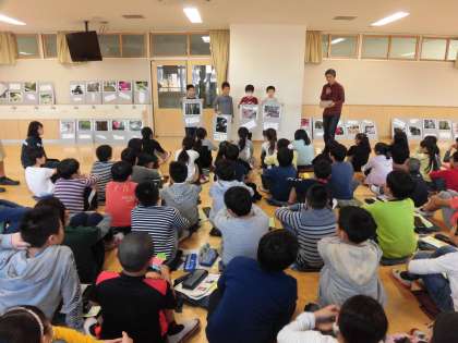 一人ひとりの写真のよいところを見付けたあと、写真の題名を考えたり写真を台紙に貼ったりしました。片付けをしてから写真家の先生から子どもたちの作品についての講評をいただきました。同じ花の写真でも構図や光の加減で印象が大きく変わること、虫の目線で見てみると大きく見えることなど、子どもたちの写真からお話していただきました。今回のワークショップ開催にあたり、文学館の皆様には大変お世話になりました。感謝申し上げます。写真は、3・4時間目の3・4組の様子です。