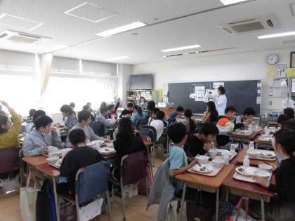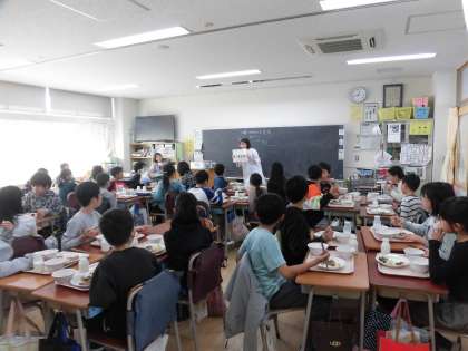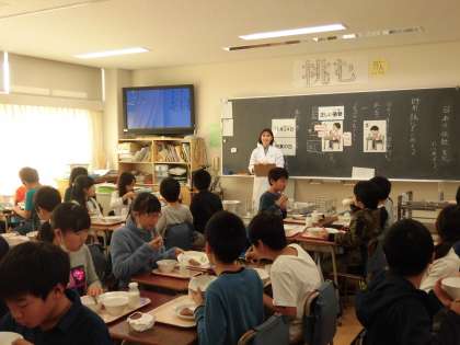 27日(火)の給食時間中、栄養職員による5分間食育がありました。今回は、5年1組と2組で実施しました。ユネスコ無形文化遺産となった日本の和食。11月24日が「和食の日」ということから、正しい姿勢で食事をとることの大切さを学びました。話を聞いている途中で、姿勢を正した子が多くいました。