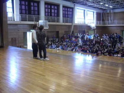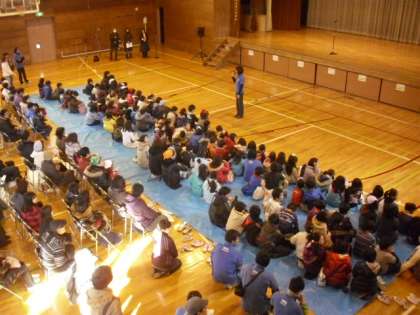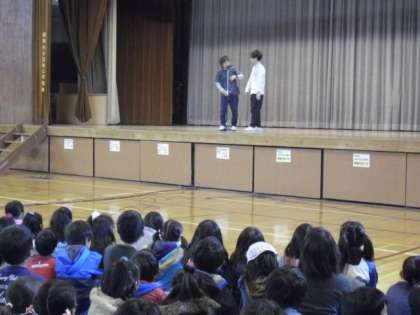 新年親子お楽しみ会の開会式の様子です。渡部校長より「一日楽しみましょう」という開会の挨拶がありました。そして「お楽しみの会」の始まりです。オープニングは、「ランダムシェイク」という若手の芸人さんの漫才からスタートです。テンポのよいかけ合いや動きに子どもたちも大喜びでした。