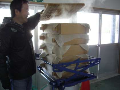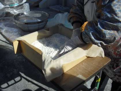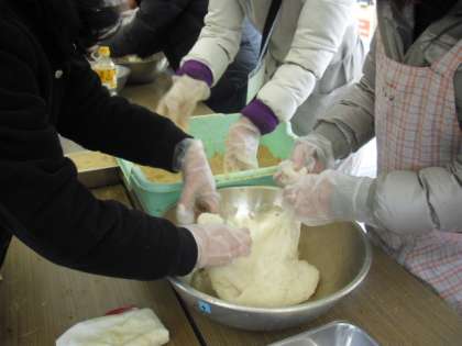 次から次へとおもちがつき上がります。もち米を蒸す作業も同じように進めていきます。つきたてのおもちは食べやすい大きさにちぎって、きな粉やあんこにからめて参加者に配られます。