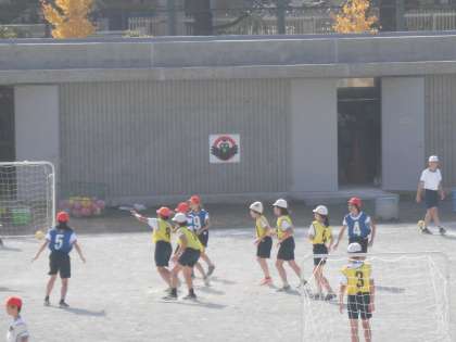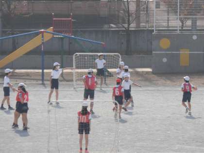 28日(水)の4時間目、6年2組は体育の時間でした。校庭で「ハンドボール」に取り組んでいました。チームごとにパスやシュート練習を行ってからゲームをしました。回を重ねるごとにパスが素早く正確に出せるようになってきています。