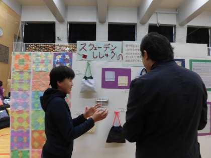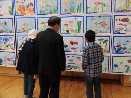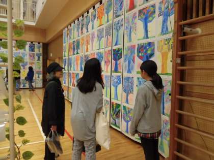 12月1日(土)の展覧会では、6年生がミニ学芸員を務めました。クラスの持ち時間は30分間です。来校された保護者、地域の皆様に声をかけて作品の紹介をしました。6年生はこれまで担当する学年の作品について取材をして原稿を書き、伝える練習をしてきました。「緊張する。」と言いながらも「こんにちは。6年○組の○○です。作品の紹介をさせてください。」と練習通りにガイドをしました。