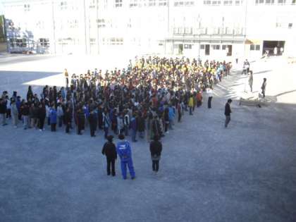 全校朝会の様子です。開始時間前には、ほとんどの子どもたちが整列しています。これまで積み上げてきた成果です。