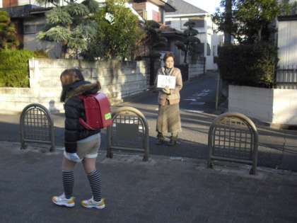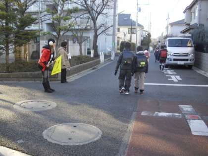 今朝のあいさつ運動の様子です。郵政公社前には、学校運営委員と校外班の旗振り当番の方が立ち、あいさつをしているところです。文学館入口付近には近所の地域の方がサポーターカードを持ってあいさつをしてくださっています。このカードは、芦花小中学校の子どもたちが安心してあいさつができる目印として、協力してくださる方に配布しています。