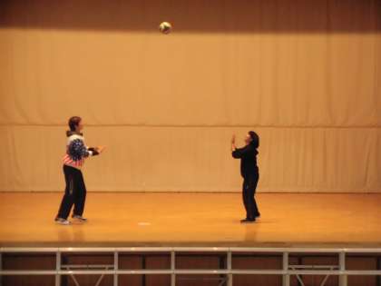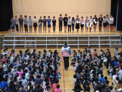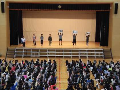 7日(金)の朝は体育館で集会をしました。今回は、オリンピック・パラリンピック委員会の発表です。元バレーボールアメリカ代表選手のヨーコ・ゼッターランドさんにお越しいただきました。ご本人に関する4つの質問をクイズにして出題し、一つずつお話をしていただきました。日本とアメリカの違い、初めて出場したオリンピックのこと、銅メダルを獲得したときの思い、そして子どもたちへのメッセージを大変わかりやすく、丁寧な言葉で話してくださいました。ミニアトラクションとして、バレーボール経験者の先生とオーバーパスを実演してくださいました。バックパスに会場から驚きの声が上がりました。司会・進行はオリ・パラ委員会の子どもたちが行いました。声の大きさ、態度がとても立派でした。