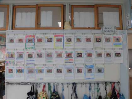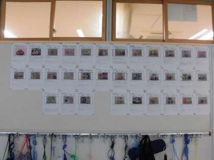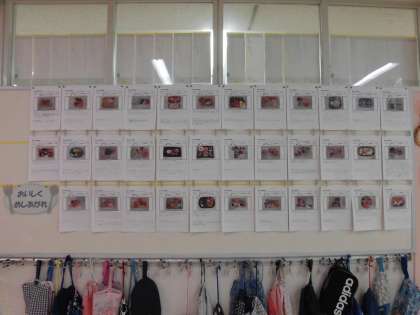 2年生の廊下には、図画工作の時間に取り組んだお弁当の写真と紹介文(「おいしくめしあがれ」)を掲示しています。粘土に絵の具で色を付け、おにぎりや唐揚げ、ハンバーグなどを表現しました。完成したお弁当を担任の先生が写真に撮り、子どもたちがお弁当の紹介文を書き込みました。かわいいお弁当ばかりで見入ってしまいます。