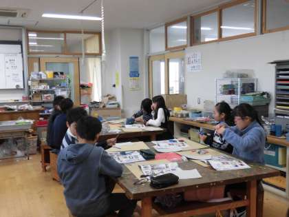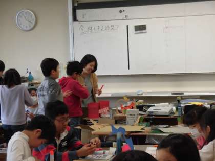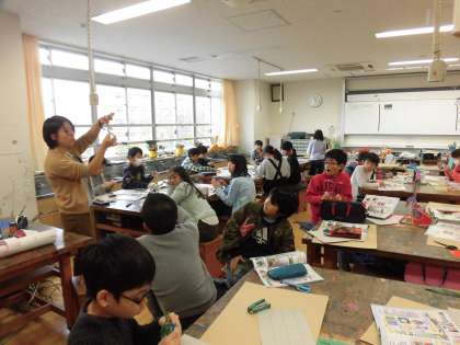 10日(月)の3・4時間目、5年2組は図画工作の時間でした。教科書にある「ひらめきコーナー」から「動き出すストーリー」に取り組んでいました。短冊に切った工作用紙を重ね合わせ、その一部をステープラーでとめて動きをつけます。やり方がわかると子どもたちは発想を広げていました。