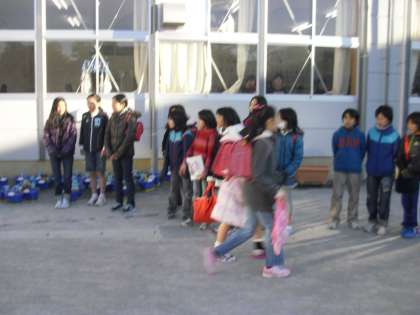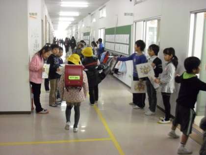 校内に入ってからもあいさつ運動は盛んです。昇降口に向かう子どもたちに元気にあいさつをする「あいさつ隊」です。教員もいっしょになってあいさつします。「おはようございます!」校庭に元気な声が響きます。
