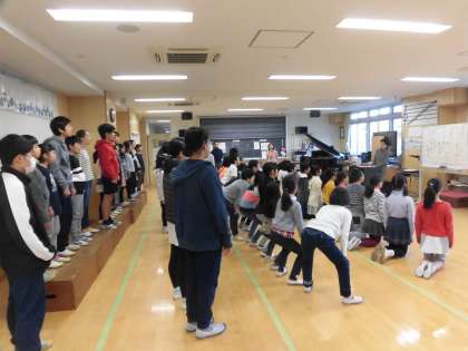 11日(火)の朝、合唱団の練習がありました。世田谷区合唱交歓会が近付いているので、仕上げに取りかかっています。口の形を作ってから息をたっぷり吸う、出だしの言葉をはっきり歌う、髪の毛や服を触らないなどの細かな指示も出ています。交歓会の最後に全員で歌う「さようなら」の歌も練習を始めました。