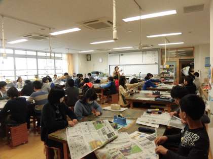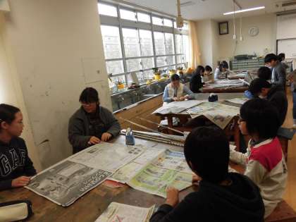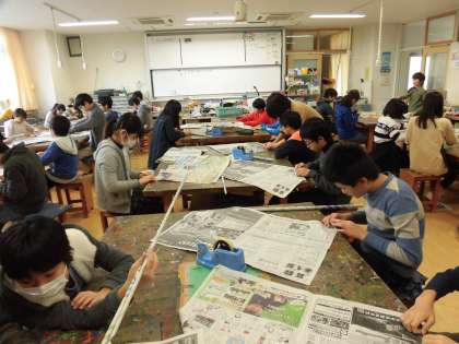 11日(火)の1・2時間目、6年4組は図画工作の時間でした。教科書にある「ひらめきコーナー」の中から新聞紙を固く丸めてグループで形を作っていきました。子どもたちは新聞紙を端から固めに丸めていくことに苦労していました。