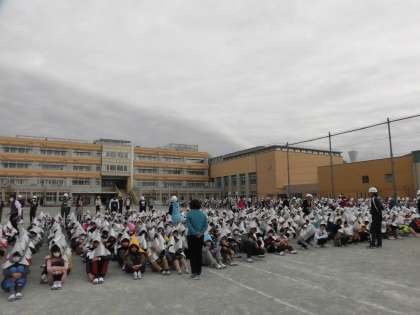 11日(火)の2時間目、避難訓練を実施しました。今回は小学校4階の家庭科室から出火し、防火シャッターが降りた中を避難するというものでした。中学生と小学生とが避難完了するのに要した時間は7分間でした。1300名が校庭に避難しましたが、静かに話を聞くことができました。