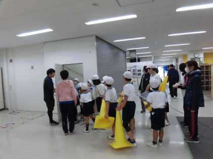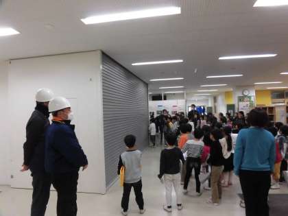 11日(火)の避難訓練では防火シャッターを使用しました。訓練直前に動物階段1階の防火シャッターを降ろしました。人数の関係から全ての学級が防火扉から避難したわけではありません。そこで訓練後、1年生やひかり学級の子どもたちが防火シャッターを見に来ました。子どもたちはその様子に驚いていました。その後、主事さん方が復旧してくれました。